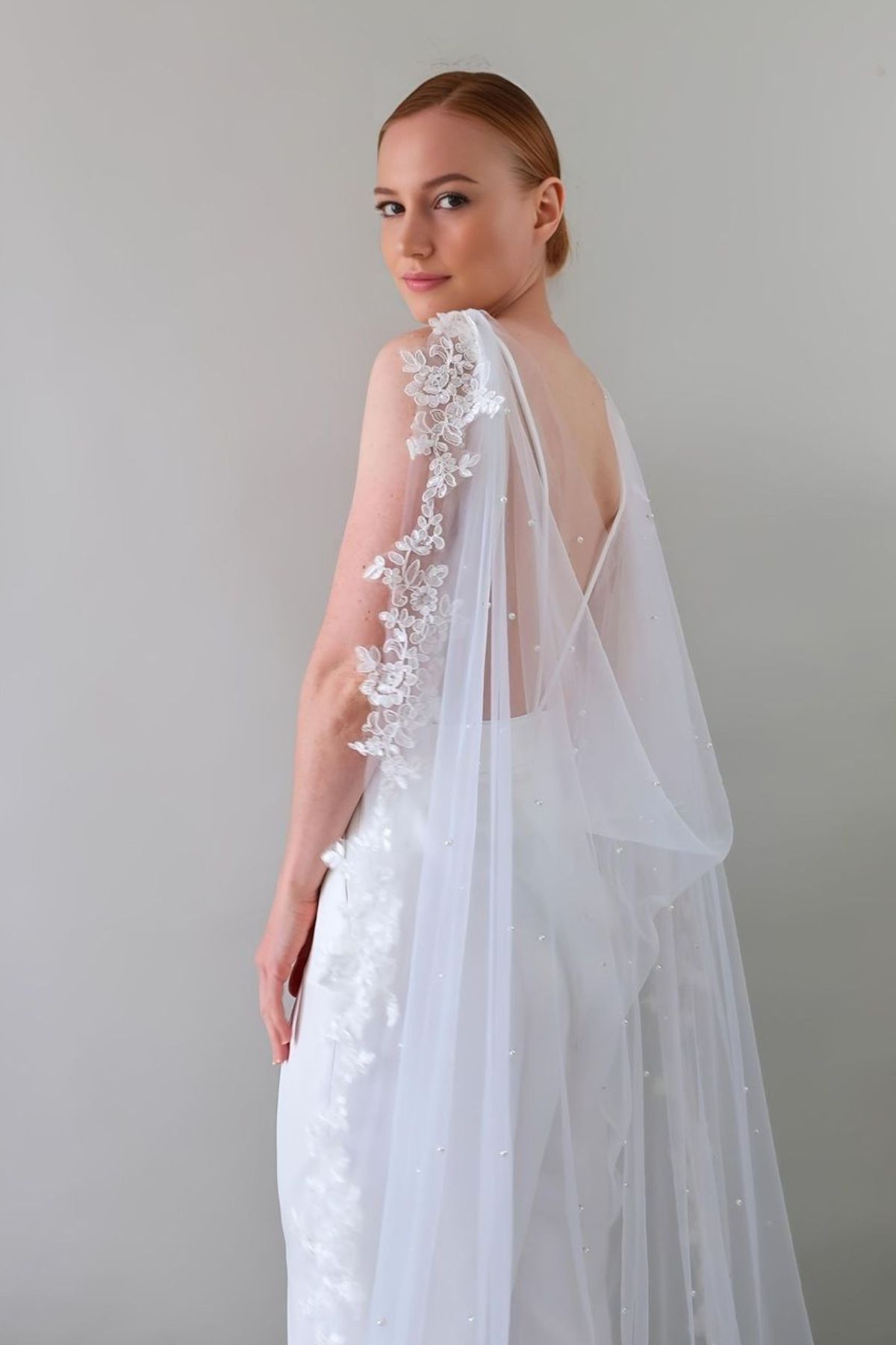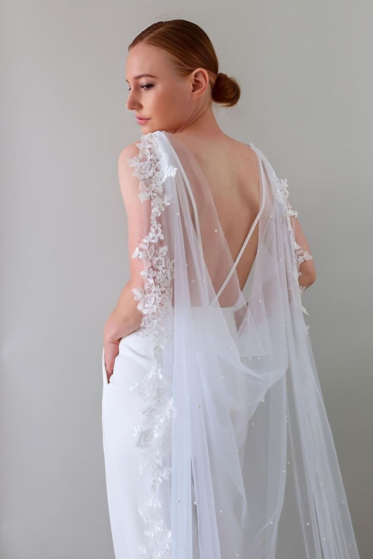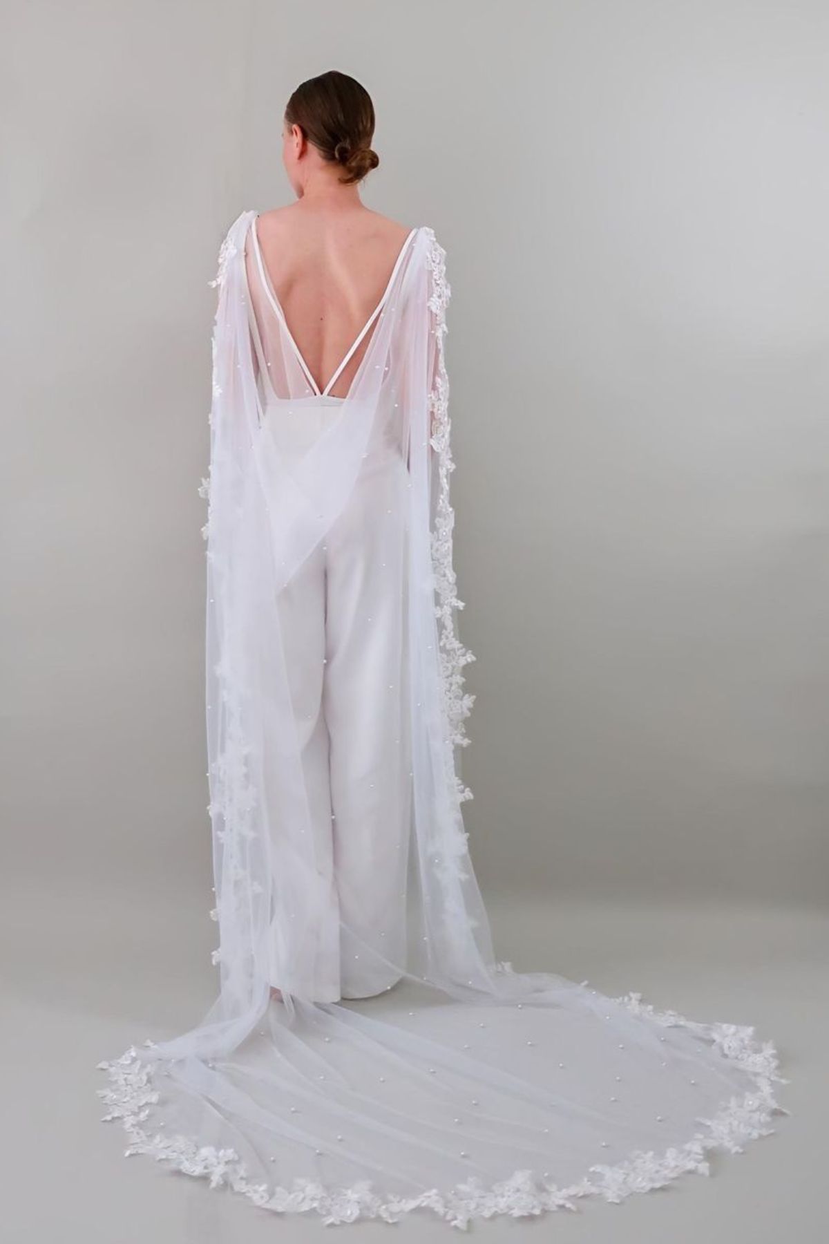 La cape amovible Capri apporte une allure féerique et sophistiquée à la silhouette de la mariée. Alternative moderne au voile traditionnel, elle se distingue par sa fluidité et son élégance aérienne. Confectionnée à la main dans un tulle doux et léger, elle est délicatement bordée de dentelle romantique et ornée de perles subtiles qui captent la lumière avec finesse. Facile à fixer dans le dos, sans altérer la coupe de la robe, cette cape longue de 2,15 m sublime aussi bien une robe minimaliste qu’une création plus sophistiquée. Idéale pour une cérémonie laïque, religieuse ou un mariage civil d’exception.