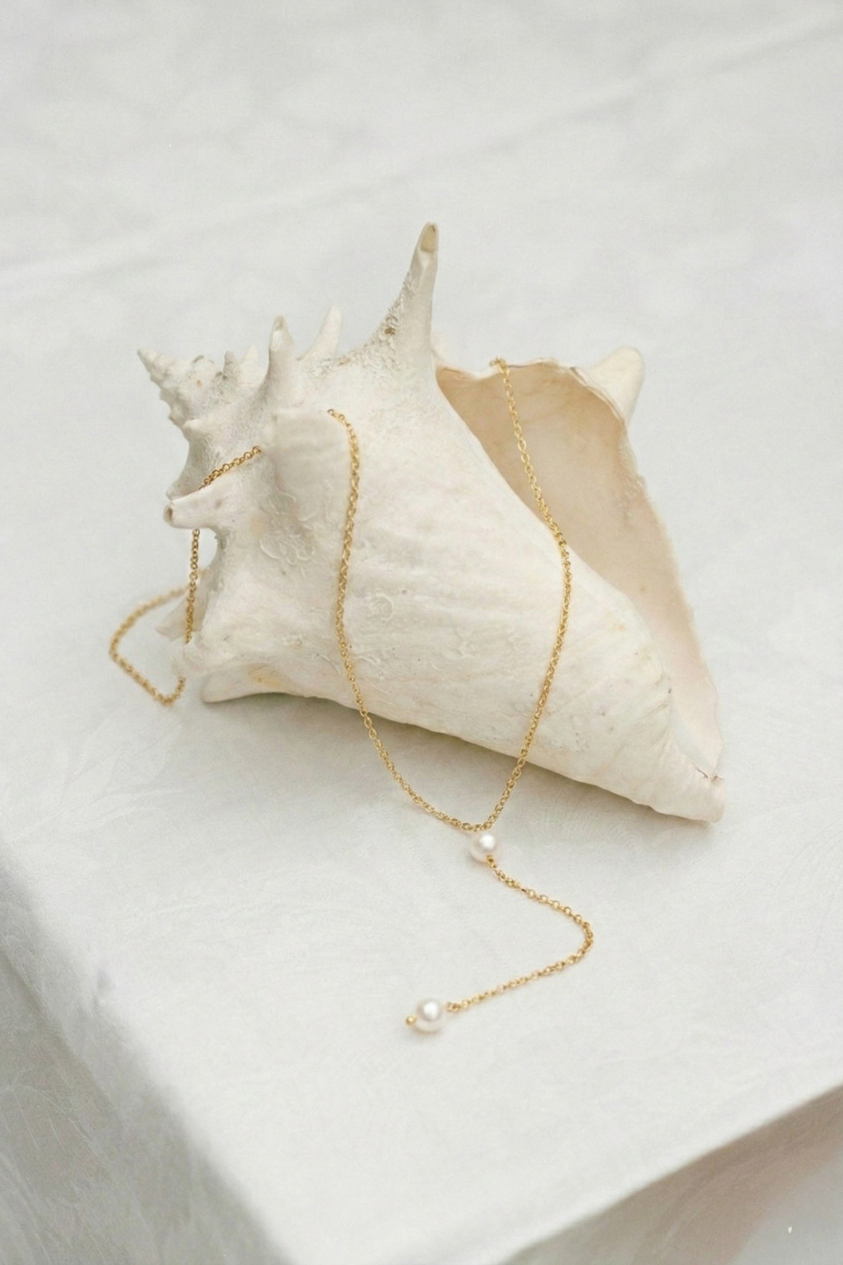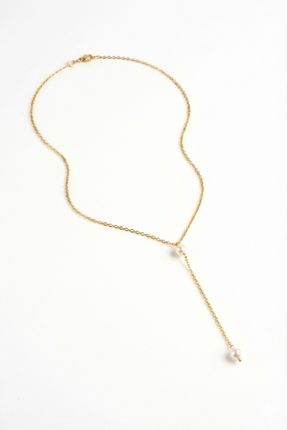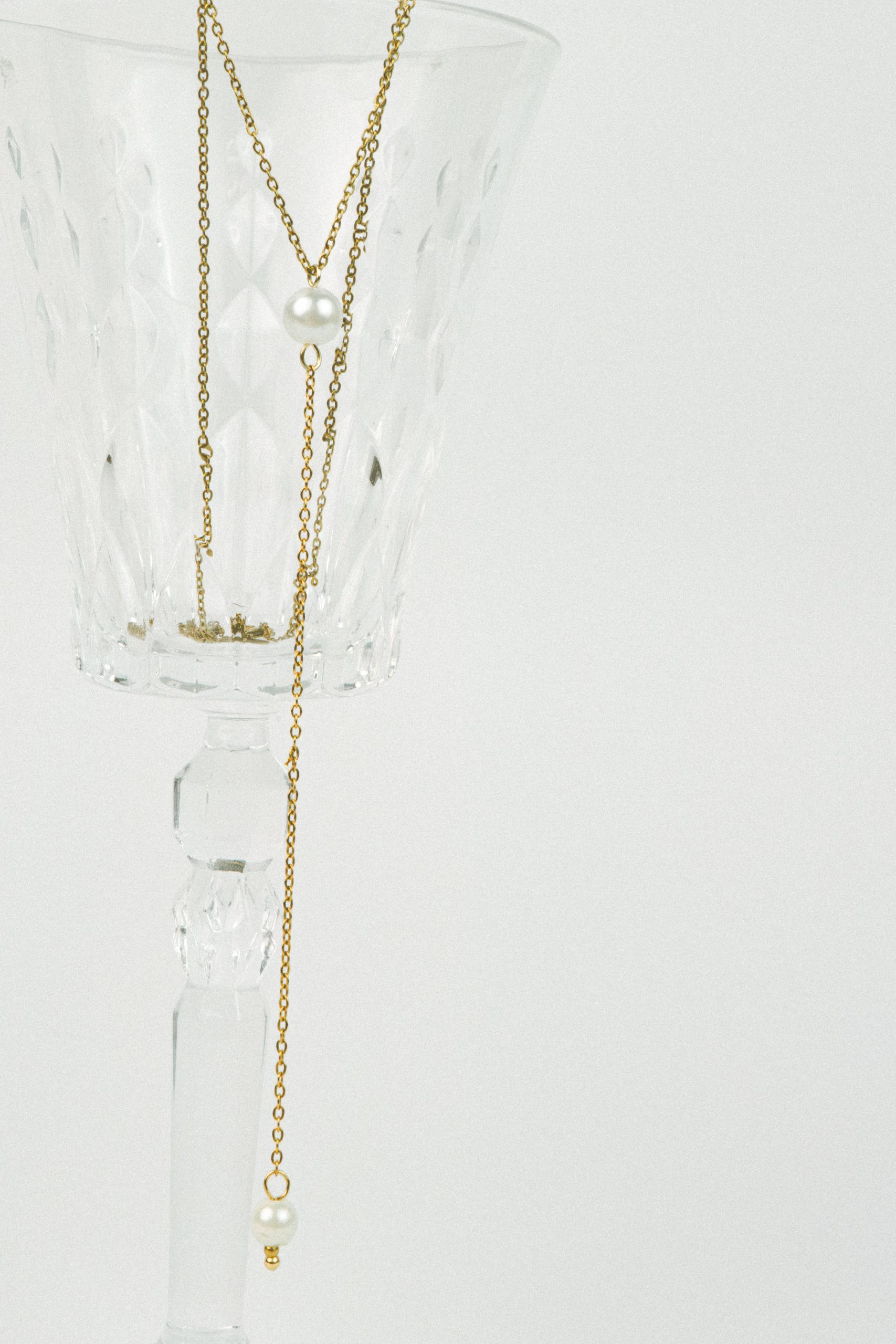 Le collier Concorde revisite l’allure aérienne de la piste parisienne dans un bijou en acier inoxydable doré sublimé par un duo de perles blanches délicatement suspendues. Sa silhouette en “Y” allonge élégamment le port de tête, tandis que la perle centrale et son pendant raffiné captent subtilement la lumière.