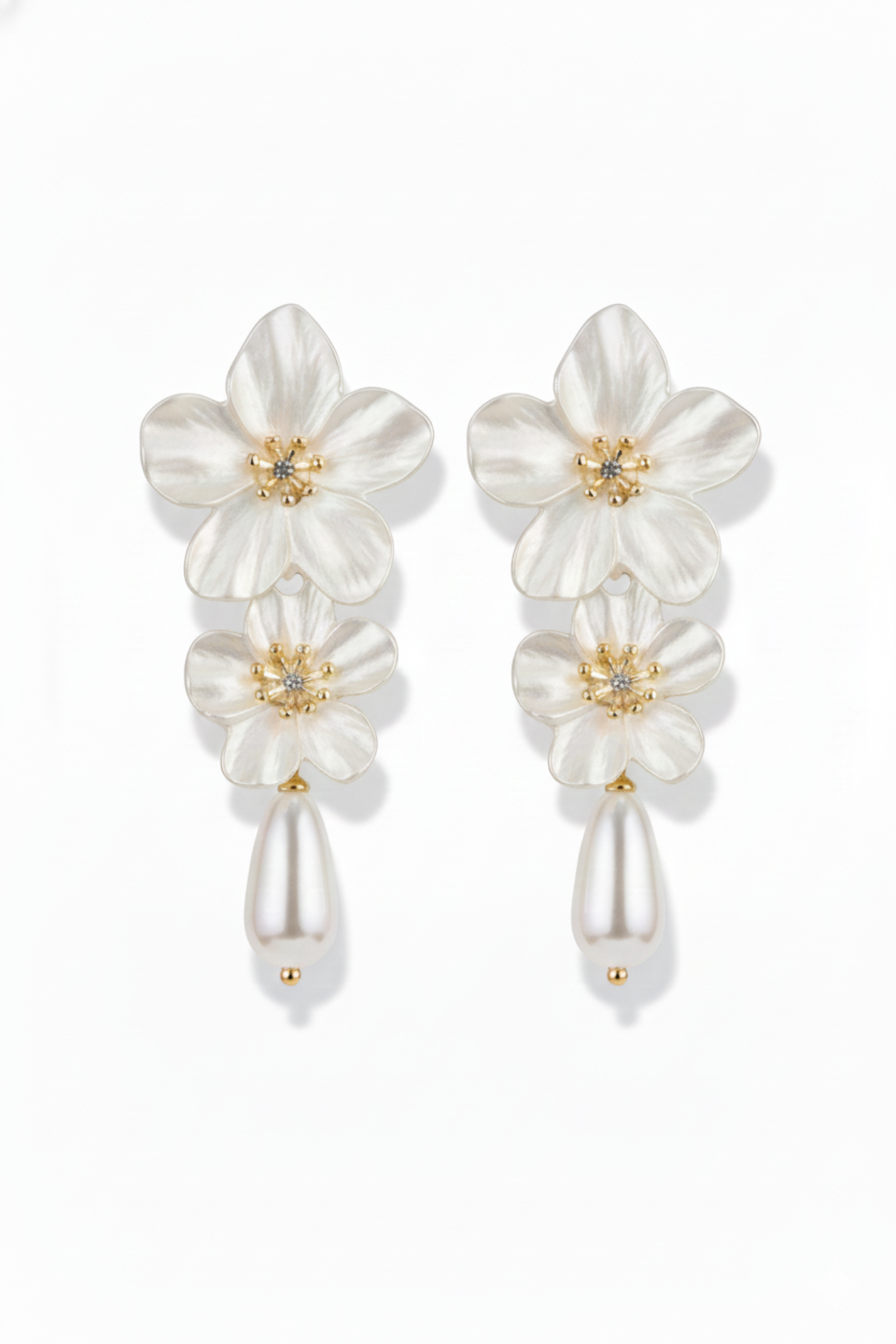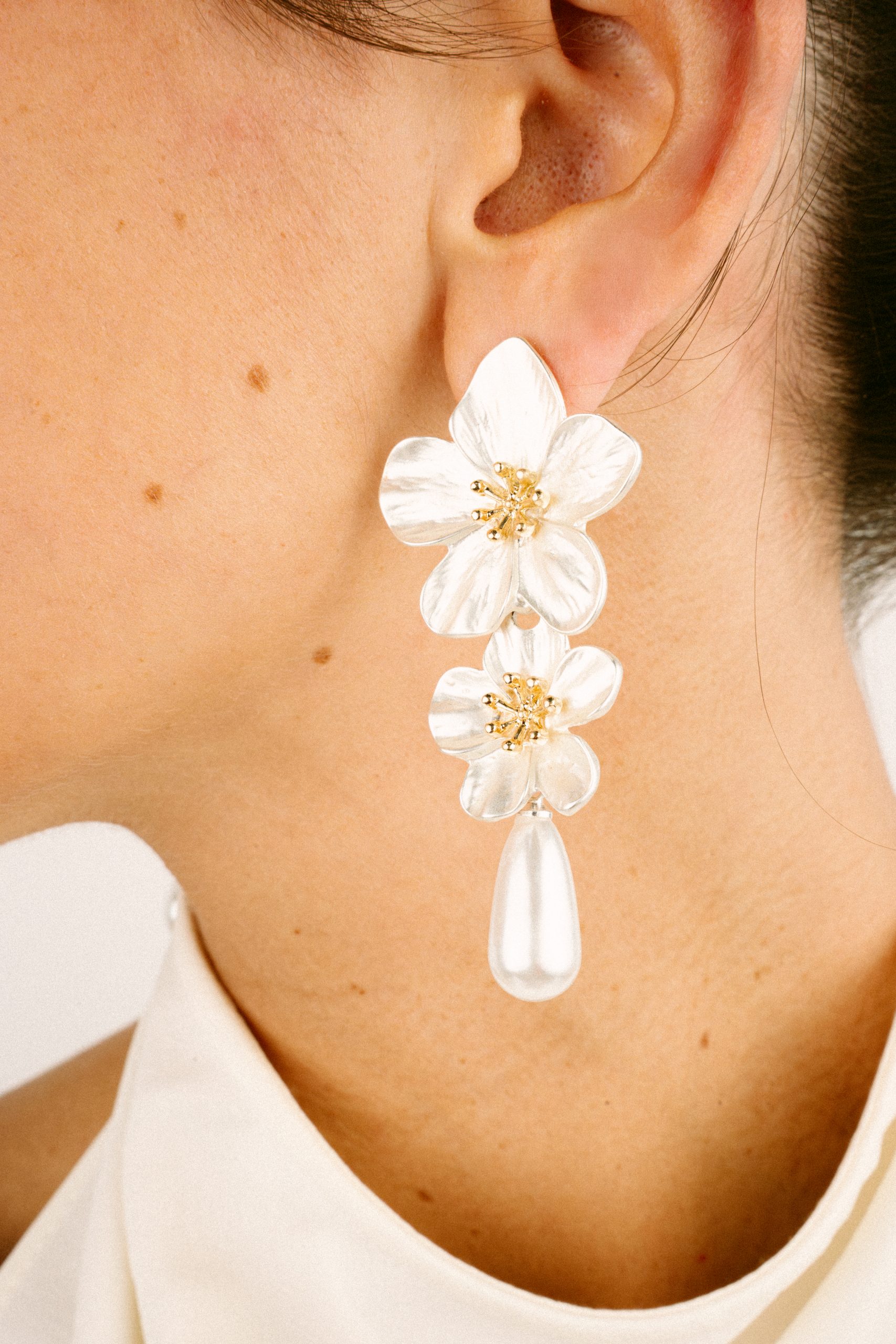 Orsay incarne l’harmonie florale et l’élégance épurée. Ces boucles d’oreilles pendantes de 7 cm marient trois fleurs sculptées en matière fantaisie nacrée à une goutte de perle blanche crème, symbole de pureté et de grâce. Leur silhouette verticale élance le port de tête et capture délicatement la lumière, pour un éclat doux et poétique.