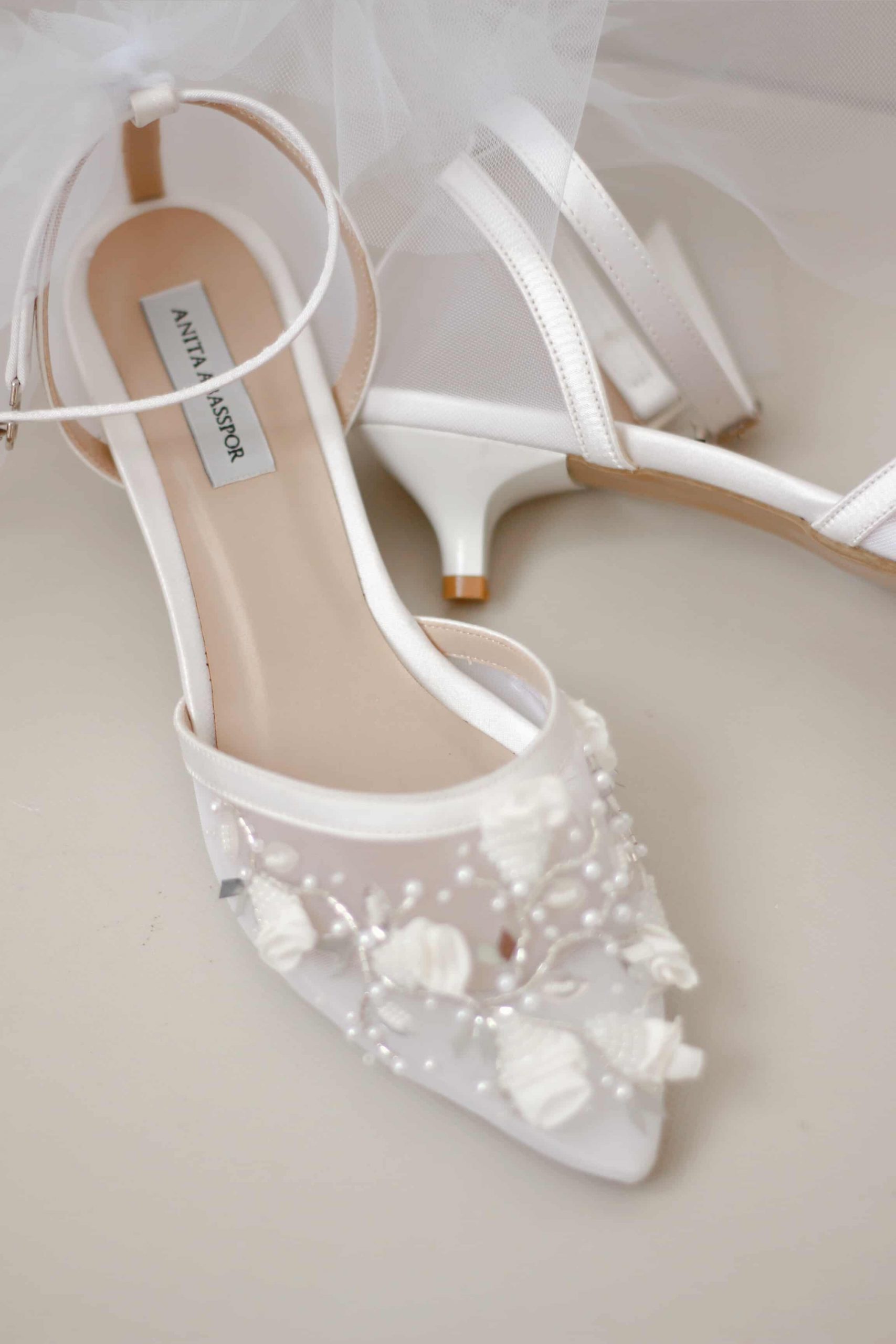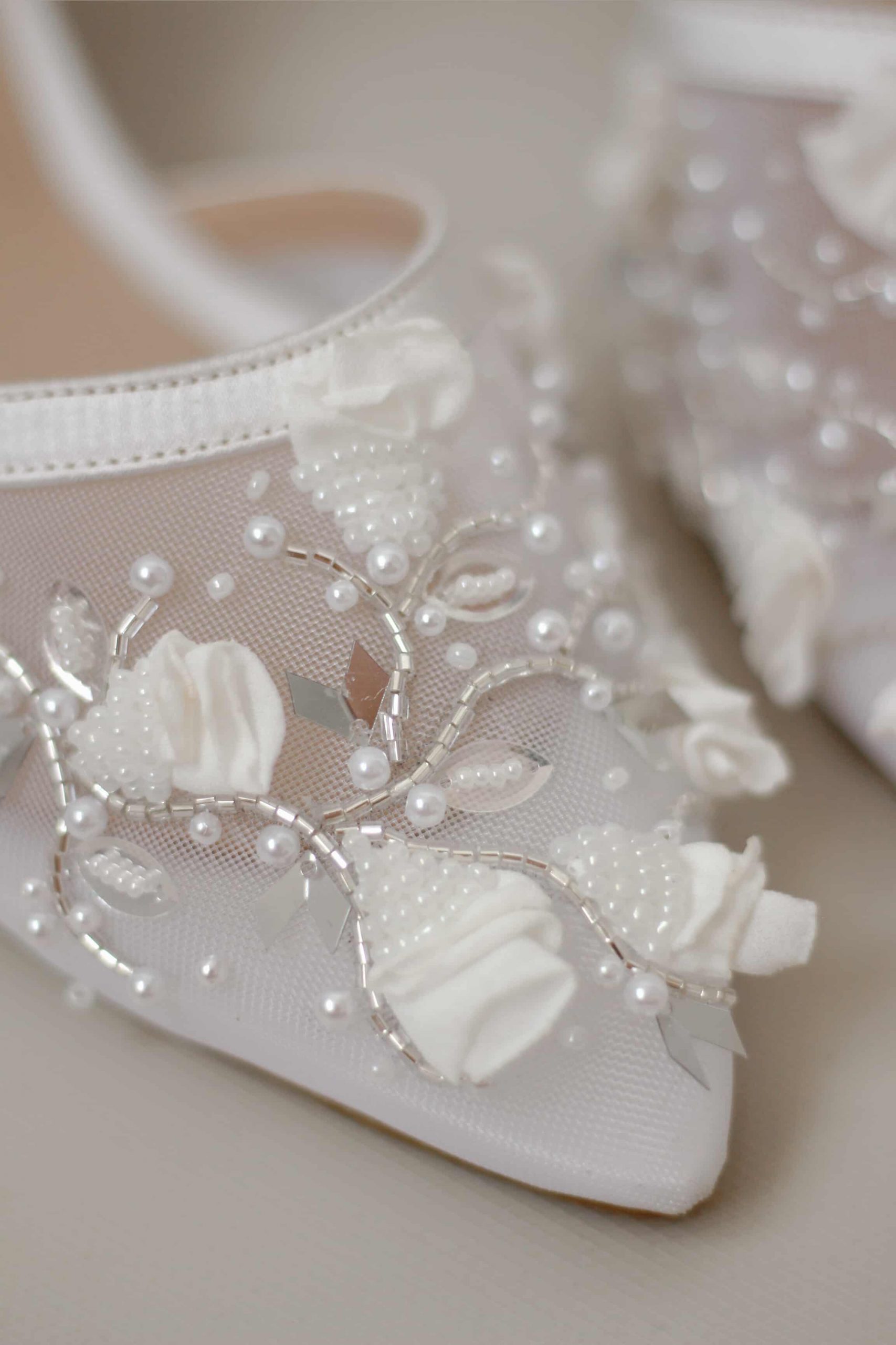 Les escarpins Poneh révèlent une élégance florale subtile. Appliqués en relief, broderies perlées et feuilles façonnées à la main composent une silhouette raffinée, pensée pour sublimer la mariée avec délicatesse et poésie.