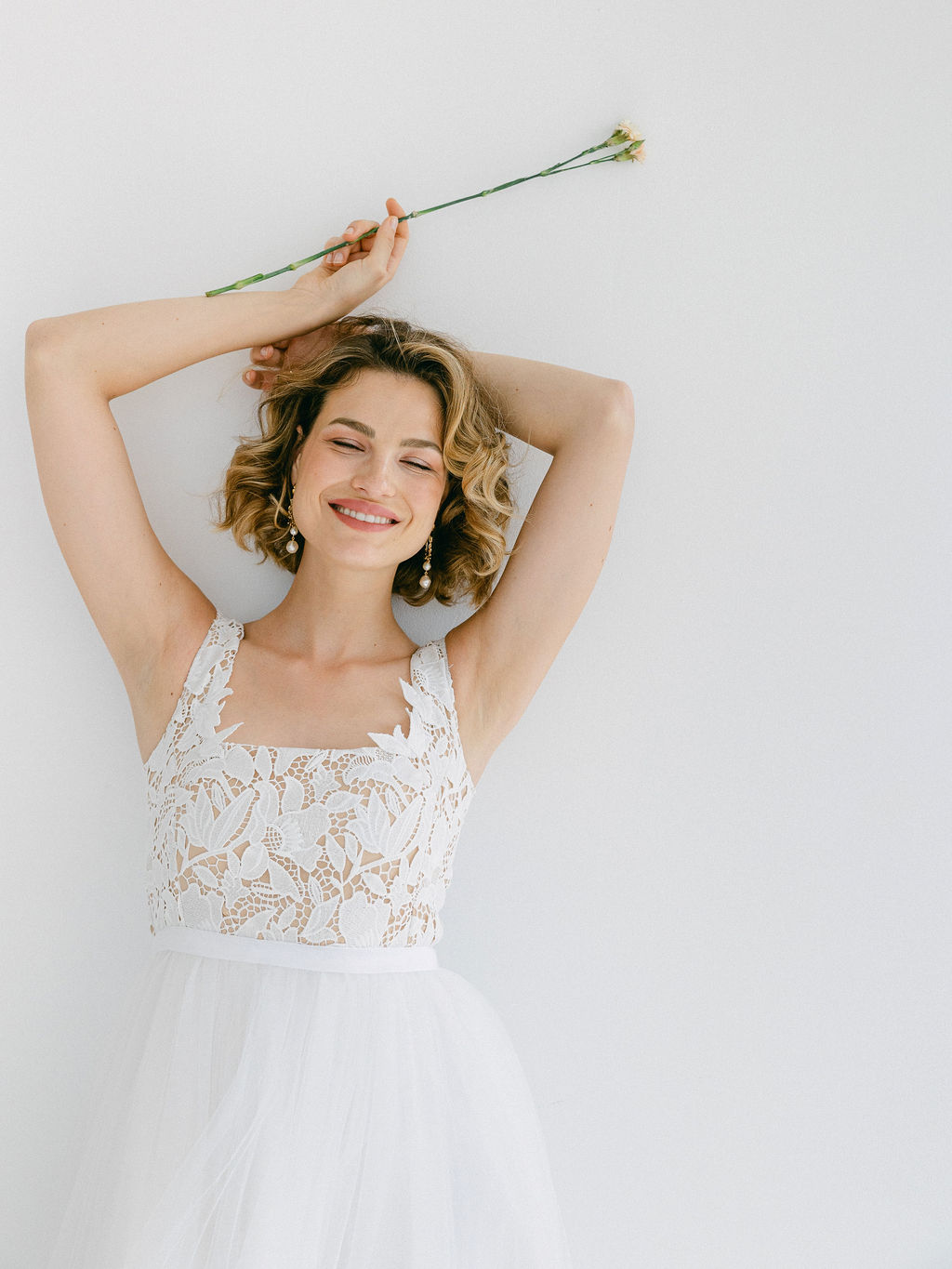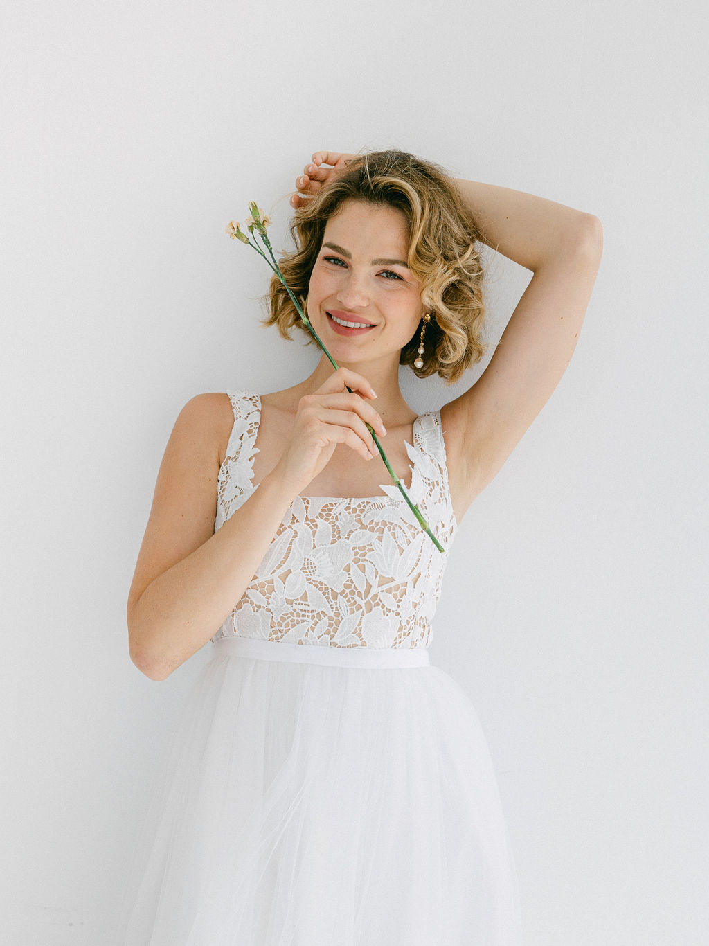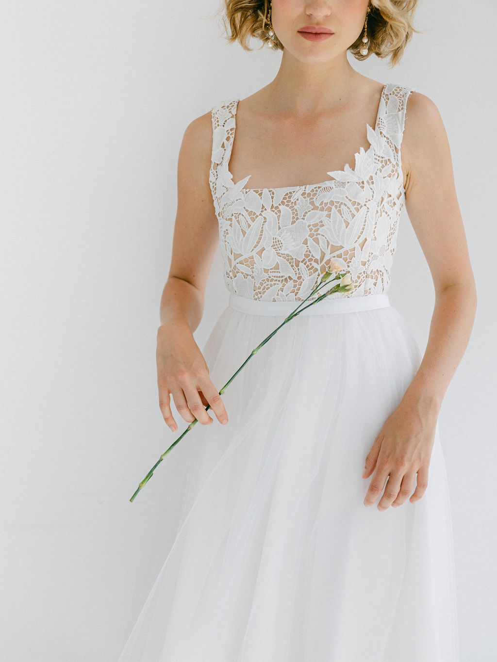La robe de mariée Lana mi-longue en tulle allie élégance et modernité. Sa coupe fluide et sa longueur mi-mollet en font un choix idéal pour un mariage civil, bohème ou romantique. Le haut en guipure blanche sur fond chair crée un effet seconde peau subtil. L’encolure carrée, ornée de dentelle, met en valeur le port de tête. Sans manches, légère et confortable, Lana offre une grande liberté. Tulle aérien, guipure délicate et allure raffinée en font une robe parfaite pour danser et se déplacer avec aisance.
